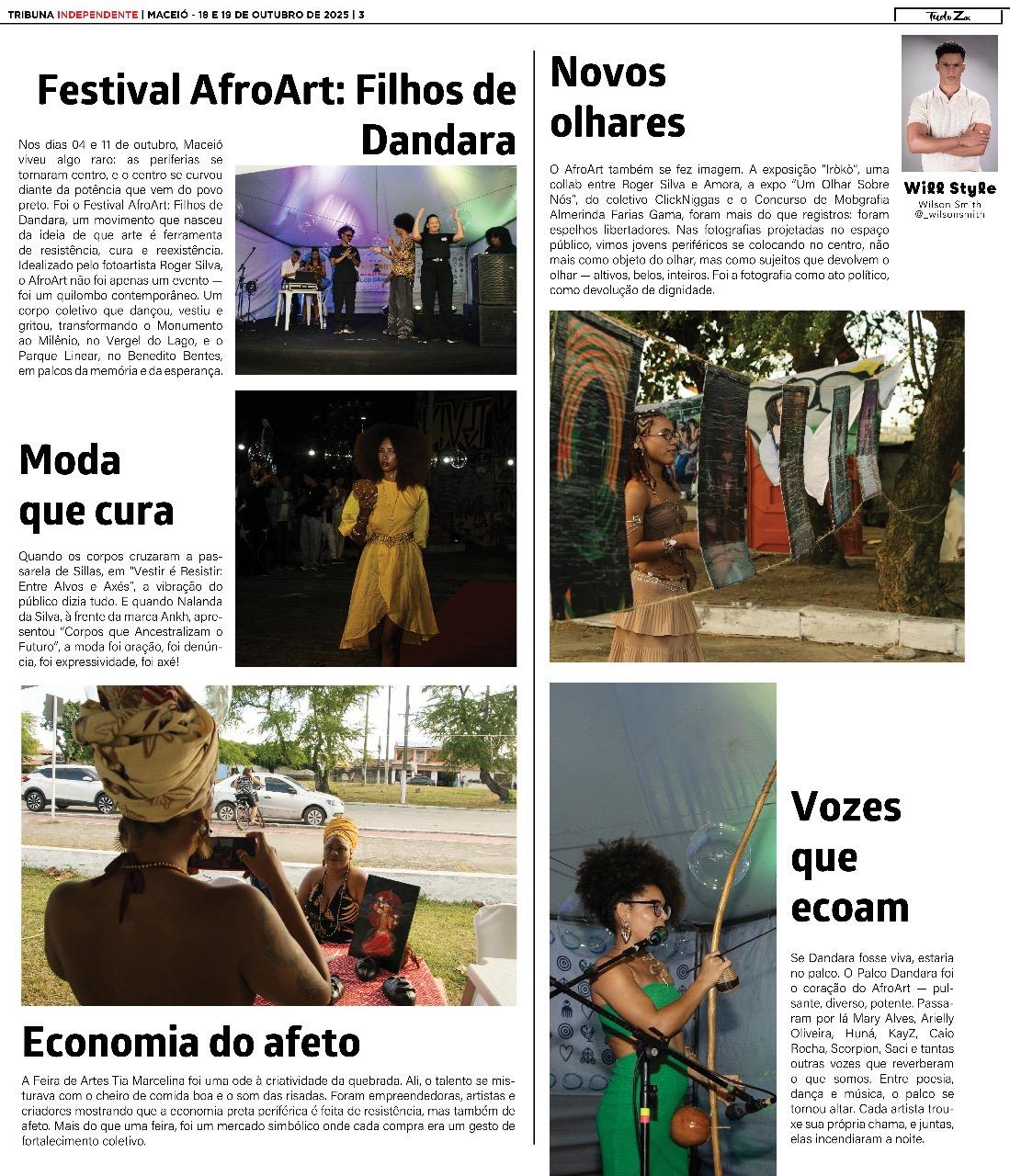 Nos dias 04 e 11 de outubro, Maceió viveu algo raro: as periferias se tornaram centro, e o centro se curvou diante da potência que vem do povo preto. Foi o Festival AfroArt: Filhos de Dandara, um movimento que nasceu da ideia de que arte é ferramenta de resistência, cura e reexistência. Idealizado pelo fotoartista Roger Silva, o AfroArt não foi apenas um evento — foi um quilombo contemporâneo. Um corpo coletivo que dançou, vestiu e gritou, transformando o Monumento ao Milênio, no Vergel do Lago, e o Parque Linear, no Benedito Bentes, em palcos da memória e da esperança.