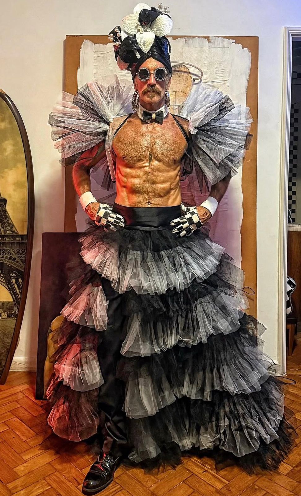 Drama e performance. A saia volumosa em camadas de tule contrasta com o peito à mostra e a estética burlesca. Óculos circulares e headpiece escultural reforçam a narrativa quase teatral. É moda como manifesto: sobre desconstruir códigos de gênero e brincar com o exagero.