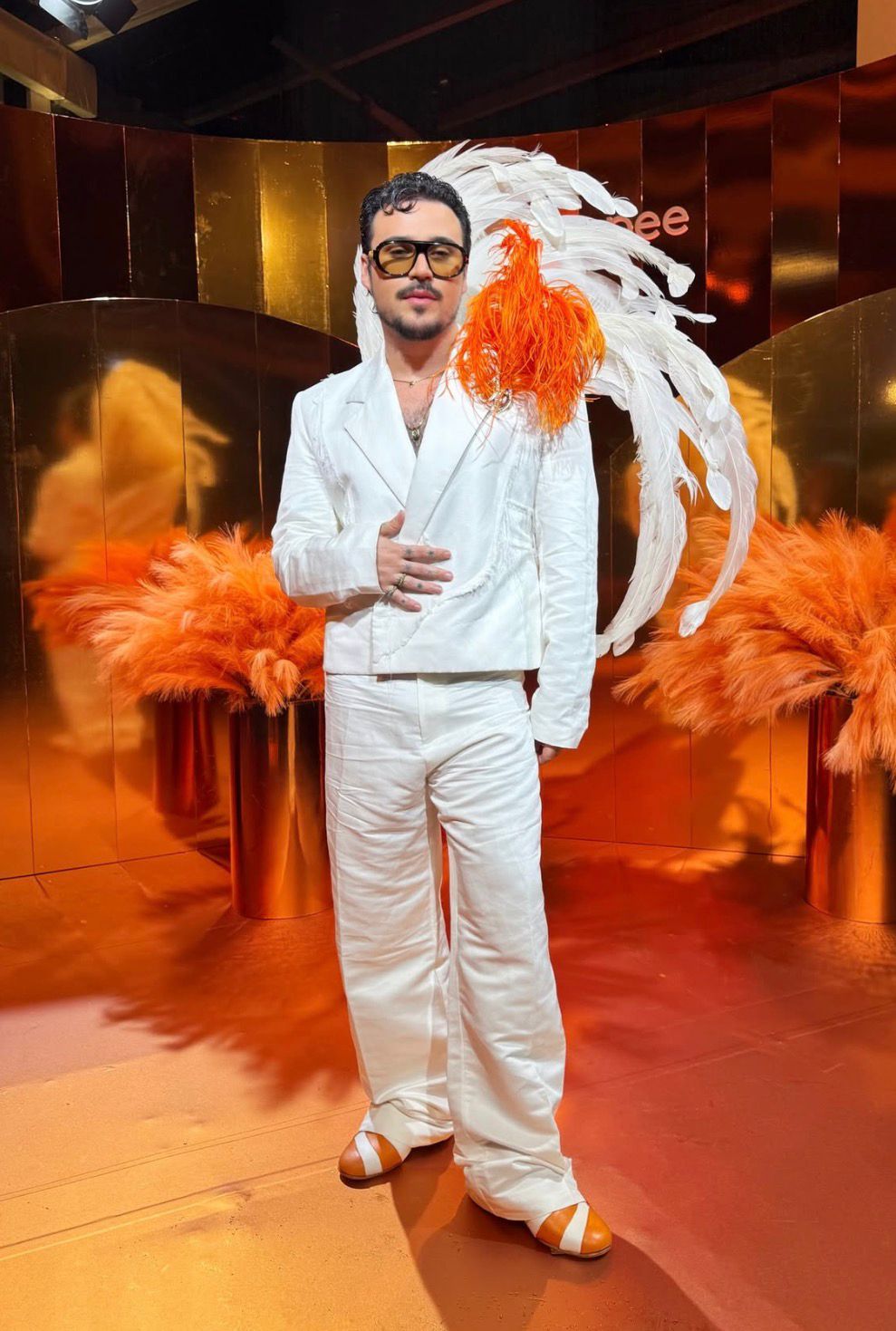 Alfaiataria branca com pegada setentista, óculos oversized e aquele toque maximalista de plumas laranja e brancas. A produção, em tom de alfaiataria desconstruída, rendeu um efeito visual super cool. O contraste entre a base minimalista e o ombro cenográfico cria um ponto focal poderoso — é sobre presença.